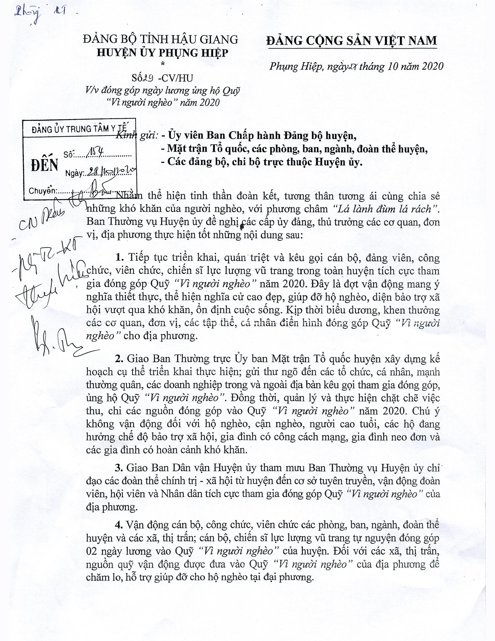 Công văn về việc đóng góp ngày lương ủng hộ Quỹ "Vì người nghèo" năm 2020